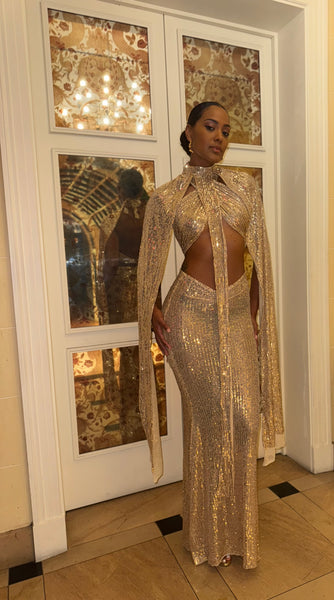 Step into your power with The Empress, a commanding gold sequin masterpiece designed to illuminate every room you enter. This gown features a sculpted silhouette that celebrates the feminine form, while a daring central cut-out reveals confidence with refined grace. The extended draped panels cascade from the shoulders, creating regal movement with every step—an effortless reminder of your sovereignty.